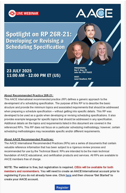 (2025年) · 2025/07/11 (JUL. 23) Spotlight on Recommended Practice 26R-21: Developing or Revising a Scheduling Specification DATE: 2025. July 23 © AACEI Return To News Top (© AACE International) tagPlaceholderカテゴリ: AACE-International コメントをお書きください コメント: 0